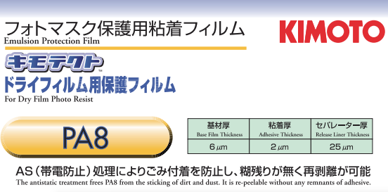 加工定制:否 型号:PA8 菲林保护膜:每箱2卷 1、印刷电路板制程用底片保护膜。 2、保护膜底片表面的胶膜具有极佳的黏着性与极薄的厚度。 3、拥有极高的透光性以产生良好的视觉效果。 4、保护膜与底片剥离后不会有残胶的现象。 5、表面经抗静电处理可避免灰尘或污染物的粘黏。 6、经压膜后仍可维持稳定的黏性。 7、可应用于各种不同的底片尺寸上。 一、哑面(干膜型)系列 产品说明 特别设计用来针对精细线路板底片、干膜底片的保护工作 具有高度透明及透光的特性。 表面经抗静电处理,避免碎屑及灰尘附着。 可将底片上的保护膜撕开,而底片上不会残留任何黏性物质。 针对广泛的应用需求,薄膜厚度只有6um具有极佳的传真度。 在环境湿度的改变上亦具有很杰出的尺寸稳定作用。 特点 保护底片药膜。 延长底片的工作寿命。 可轻易地移去粘黏上的碎片及油墨。 可减少底片于工作中需要检查的次数。 雾面化的表面说明其快速且均匀地抽真空。 8.菲林保护膜常用规格:560/510/530/610。 -